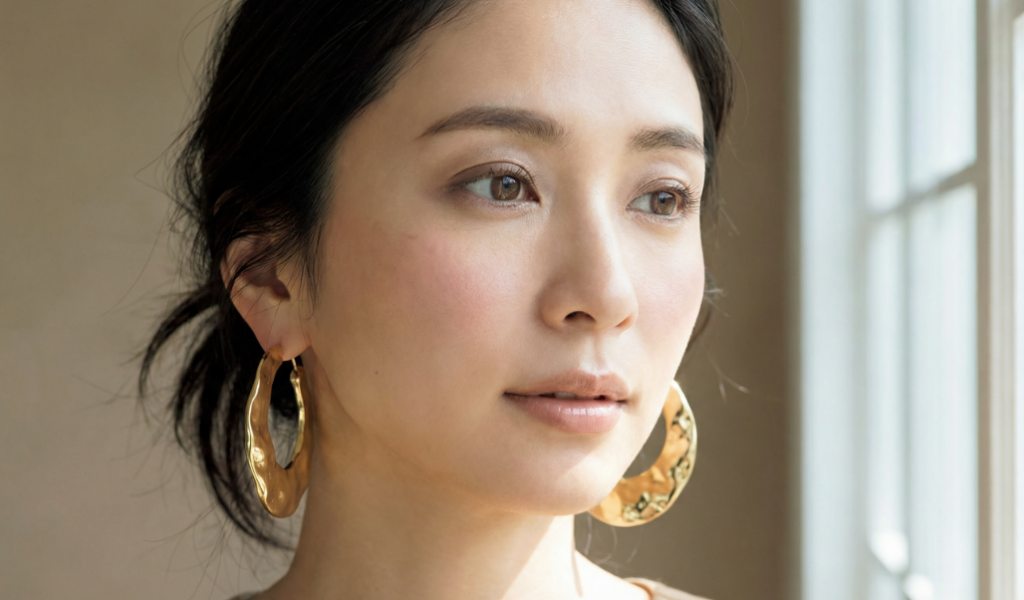 なじんでいるアクセサリーは、視線を邪魔せず、顔立ちを引き立てます。色が控えめでも、メイクと方向性が合っていないと浮いて見えます。逆に、存在感のあるデザインでも、肌色やメイクの色味と調和していれば、違和感は出ません。目立つかどうかではなく、顔全体の流れを止めないかどうかが基準になります。