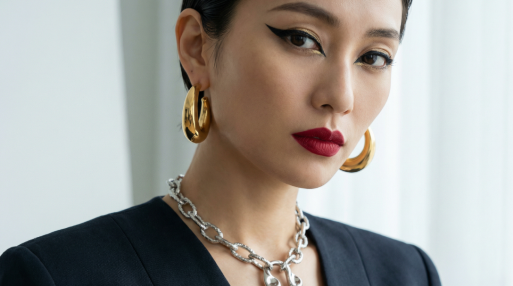 アクセサリーを主役にするなら、メイクは色数と質感を絞り、顔立ちを整える役割に徹します。メイクを主役にするなら、アクセサリーは形や光沢を抑え、印象を邪魔しないものを選ぶと全体が安定します。この軸を外さなければ、ゴールドかシルバーか、濃いか薄いかで悩む場面は自然と減っていきます。