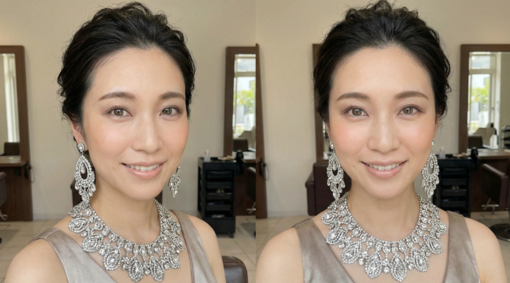 特別な日は、ついアクセサリーもメイクも足したくなりますが、どちらかを主役に決めたほうが洗練されます。アクセサリーを目立たせるならメイクは引き算し、メイクを楽しむならアクセサリーはシンプルにまとめると、華やかさと上品さの両立がしやすくなります。