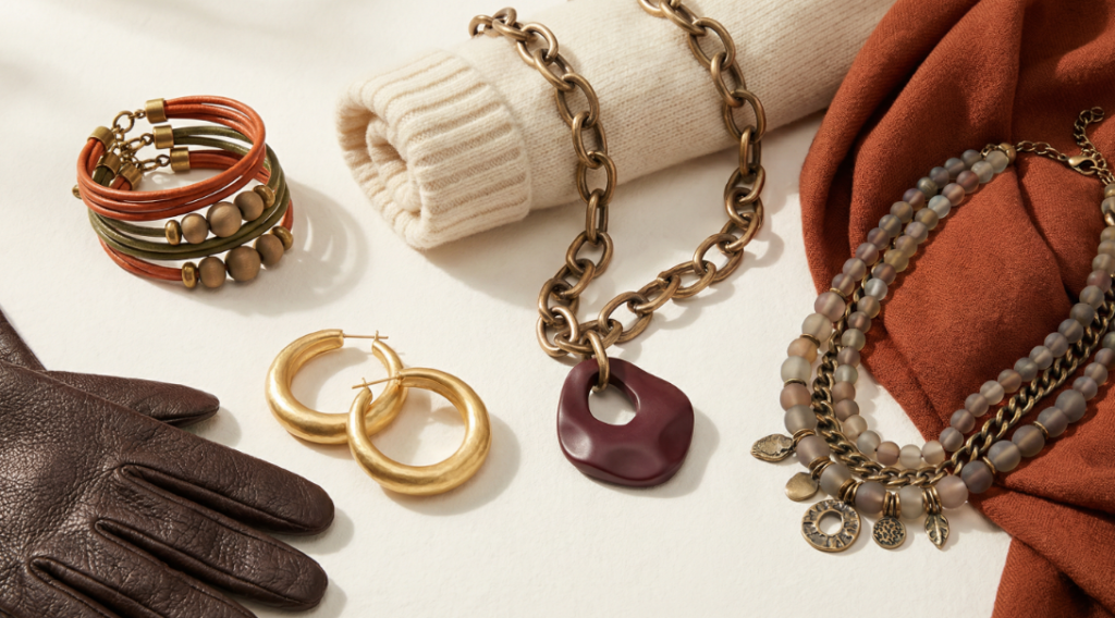 ブラウンやボルドー、落ち着いたゴールドなどは、服装に自然に溶け込み、全体を引き締めます。夏と同じ形のアクセサリーでも、色を変えるだけで印象は大きく変わります。
