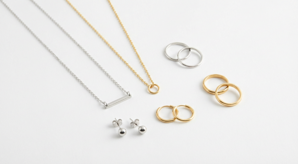 ベースになるアクセサリーは通年で使えます。色が主張しすぎないシルバーやシンプルなゴールド、装飾を抑えた形は、季節を問わず服装に馴染みます。