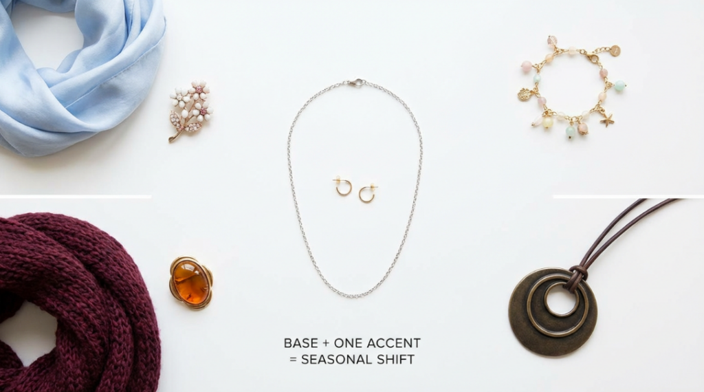 季節感は服や小物で調整し、アクセサリーは軸として固定すると無駄が出にくくなります。