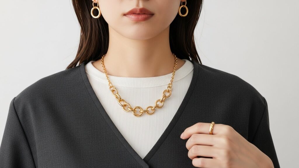 ネックレス・ピアス・リングを同時につけても、どれか1つが目立つ配置になっていれば散らかりません。すべてが同じ強さで主張すると、ごちゃついた印象になります。