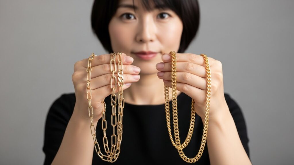 細いチェーンと太いチェーン、光沢の強いものとマットなものが混ざると、ちぐはぐに見えやすくなります。線の太さや質感をそろえると、自然にまとまります。