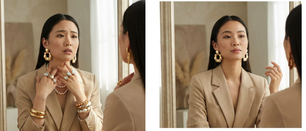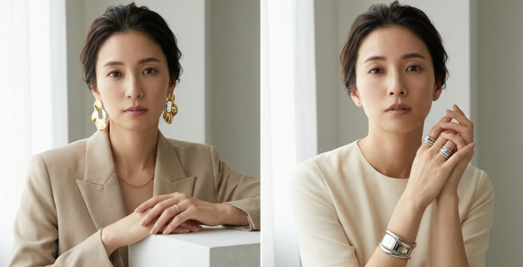 重ね付けは、うまく使えばアクセサリーコーディネートを一気に洗練させますが、境界を越えると途端に重たく見えます。ポイントは「数」ではなく、「そろっている要素」があるかどうかです。