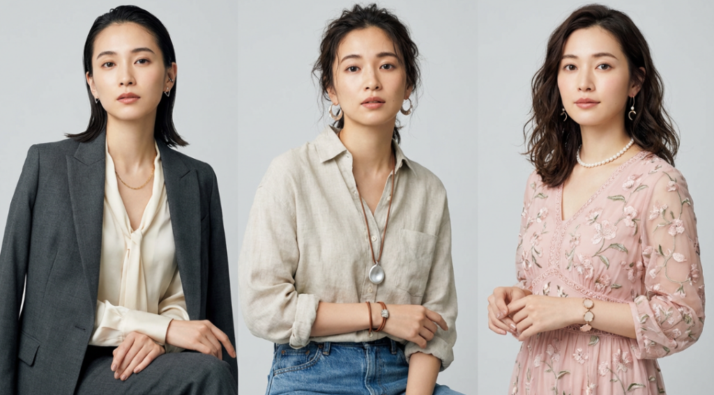 服装ごとに「ここだけ押さえる」ポイントが分かっていれば、アクセサリー選びは難しくなりません。服の役割に合わせて、アクセの出番を決めると、全体が自然にまとまります。