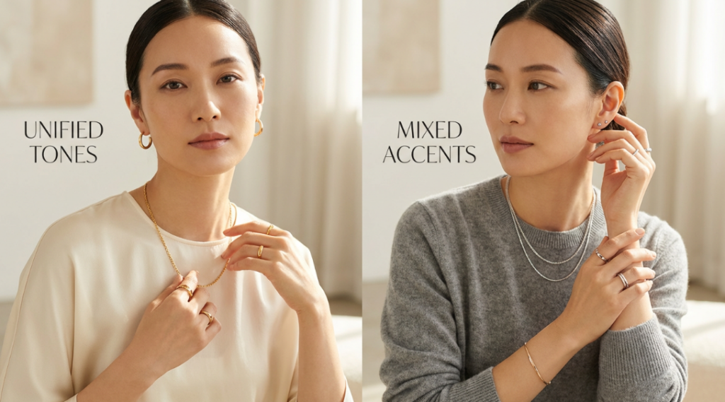 迷ったときは、ゴールドかシルバーのどちらかに寄せるだけで整います。共通点ができると、多少デザインが違っても違和感が出にくくなります。