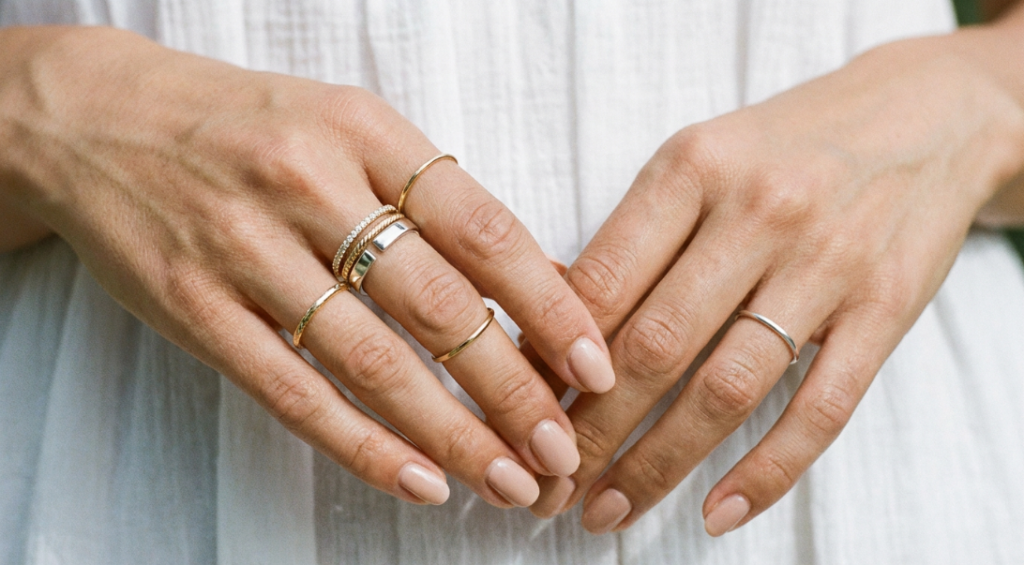 すべての指につけるより、同じ指や隣り合う指にまとめる方が、線が揃って見えます。太さに差をつけると、重ねても圧迫感が出にくくなります。