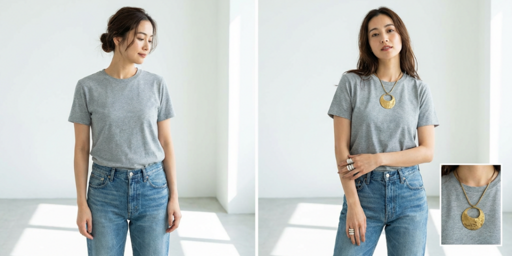 Tシャツやデニムなどラフな服は、アクセが弱すぎると物足りなく見えます。ネックレスやリングを1つ足すだけで、全体が締まり、手抜き感が出にくくなります。