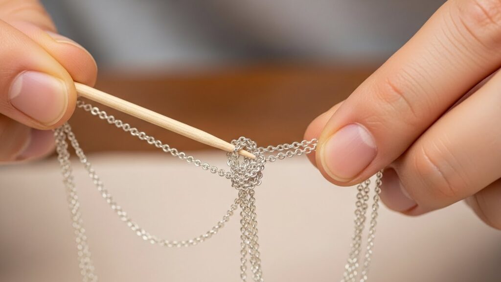 木製のつまようじは先が丸く、細いチェーンでも傷を付けにくいのが利点です。結び目の外側から差し込み、輪を少しずつ広げると、締まりが緩みます。