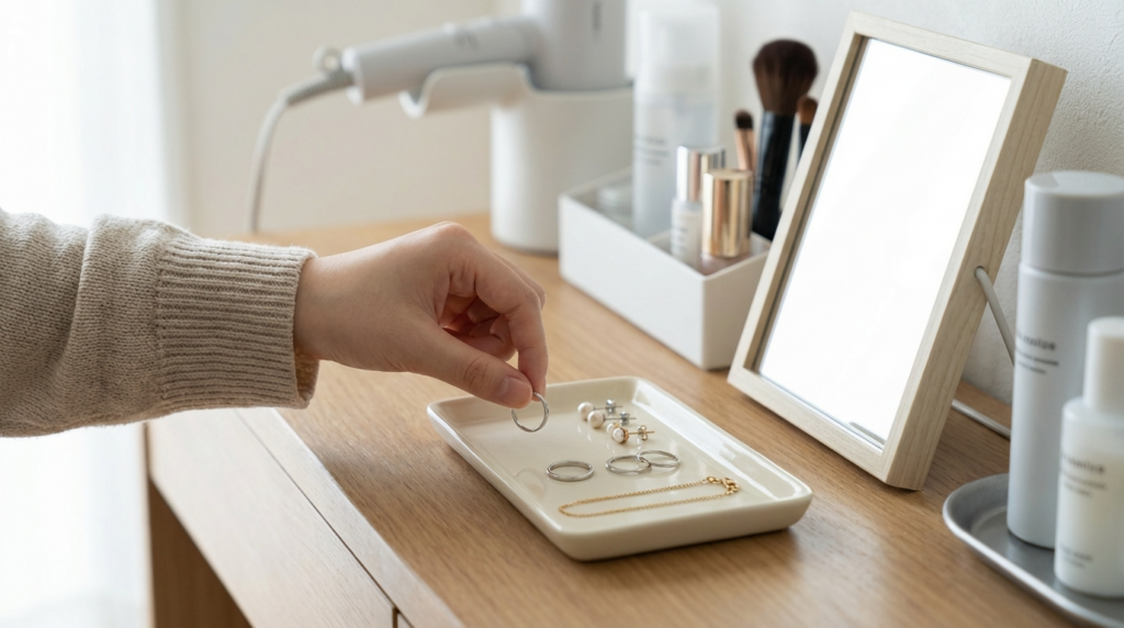 アクセサリーを外す場所のすぐ横、もしくは同じ高さに収納を置くと、外した手の動きのまま戻す動作が途切れにくくなります。指輪は外した向きのまま立てる、ネックレスは外した位置からそのまま掛けられるよう向きをそろえておくと、毎回考える必要がなくなります。手を離した流れの中で収納まで完結する配置にすると、無理なく続いている感覚が生まれやすくなります。