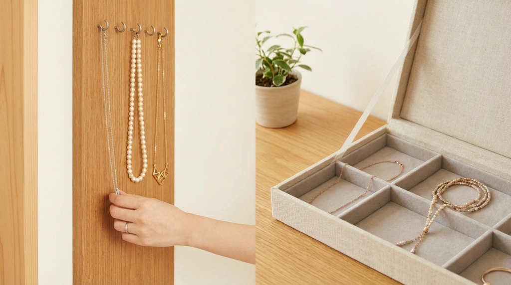 アクセサリーの収納アイデアを探していると、きれいに並んだ写真や、使いやすそうに見えるケースやスタンドがたくさん目に入ります。ただ、実際に自分の生活に取り入れてみると、ネックレスが絡んでしまったり、いつの間にか色が変わっていたり、外したあとに元の場所へ戻すのが面倒に感じたりと、別の困りごとに気づくことがあります。