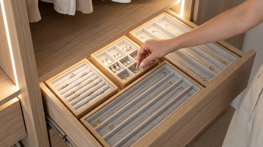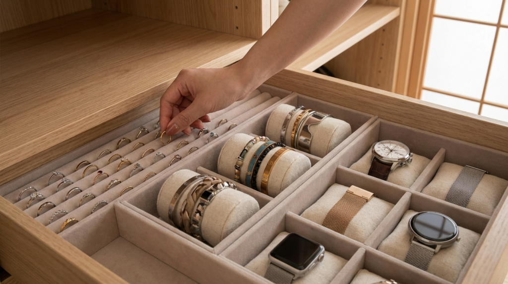 アクセサリーの収納には、見た目が整っていることと、無理なく使い続けられることの両方が求められます。棚やトレーにきれいに並んでいる状態だけを基準にすると、朝の支度や帰宅後の流れの中で、手の動きと合わないと感じる場面が出てきます。
