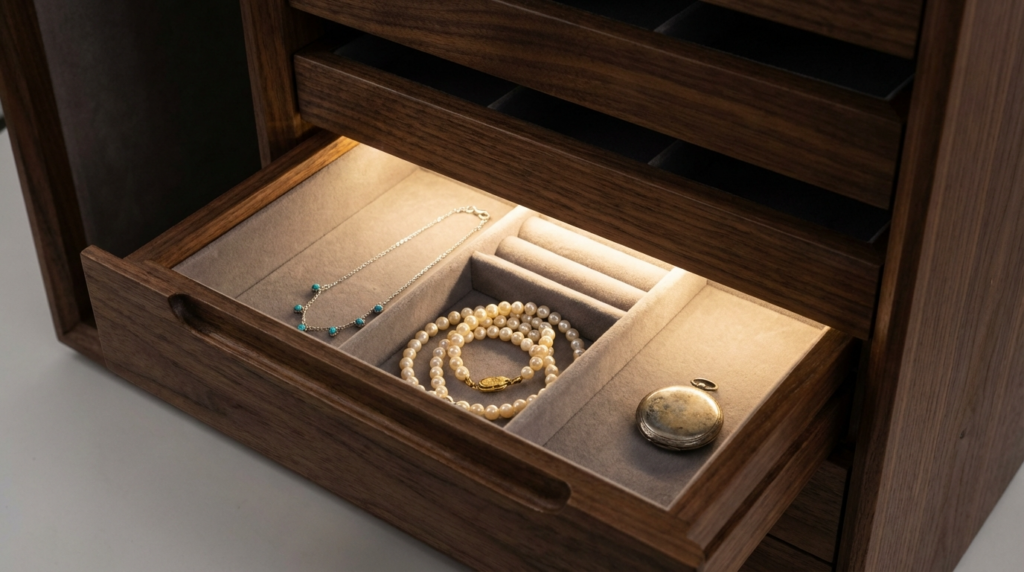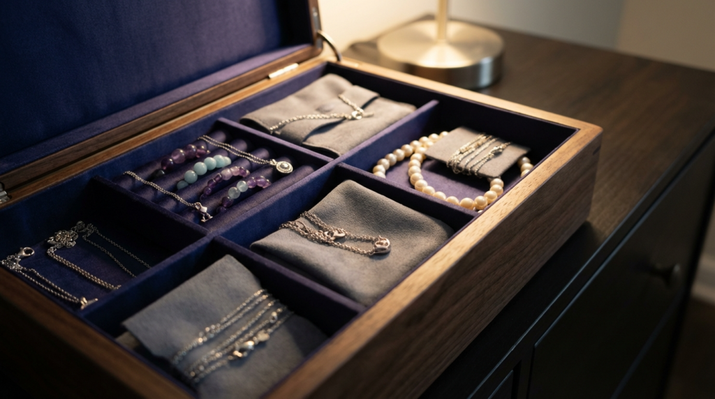 仕切り付きケースを使う場合は、仕切りの幅を動かせるタイプを選ぶか、ネックレス専用の細長い区画を別に用意することで、留め具が引っかかる動作を減らせます。留め具が頻繁に当たる場合は、ネックレスだけを個別ポケットやフック収納に分けるほうが、取り出しがスムーズになります。また、軽い素材のケースは動きやすいため、底に滑り止めシートを敷く、もしくは引き出し内で動かないサイズに固定すると、中身がずれる感覚を抑えられます。