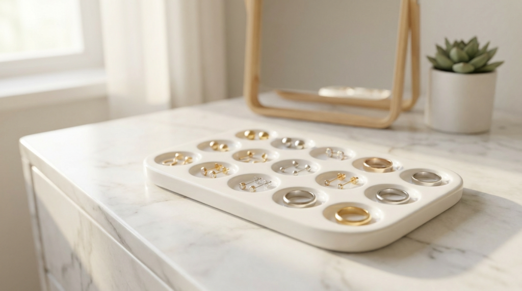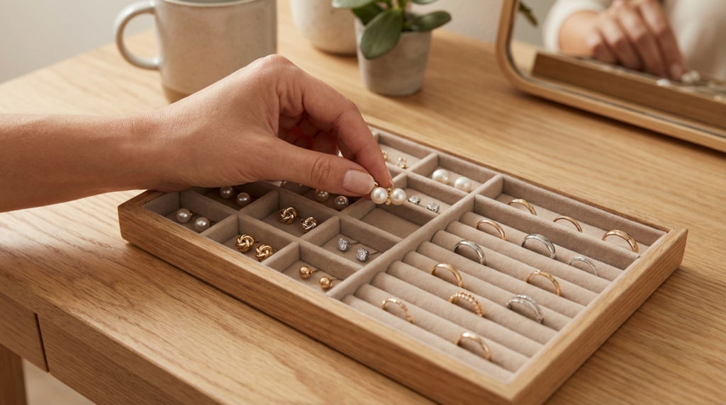 ポストタイプのピアスや小ぶりなスタッドピアス、厚みのあるシンプルなリングのように、形が崩れにくく他の物と触れても絡まりにくいアクセサリーは、出して置いても扱いにくさが出にくくなります。毎日使う一粒ピアスや結婚指輪、細身でも留め具が固定されているリングは、ドレッサーの上やトレーの定位置に見える状態で置いておくことで、朝に探す動作がほとんど必要なくなります。戻す位置を「この指輪はここ」「このピアスはこの穴」と決めておけば、外したあとも考えずに手が動き、置く行為そのものに迷いが生まれません。