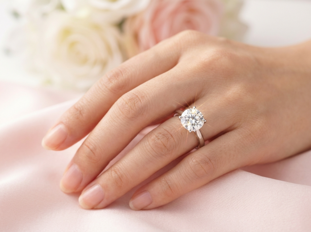 婚約指輪は、ダイヤなどの宝石が手の甲側の中央に来る向きで着けます。手を自然に下ろしたとき、正面から見て石が一番目立つ位置にある状態が基本です。立て爪タイプや一粒ダイヤのリングは、石が指先の方向を向き、左右に傾いていないかを確認します。