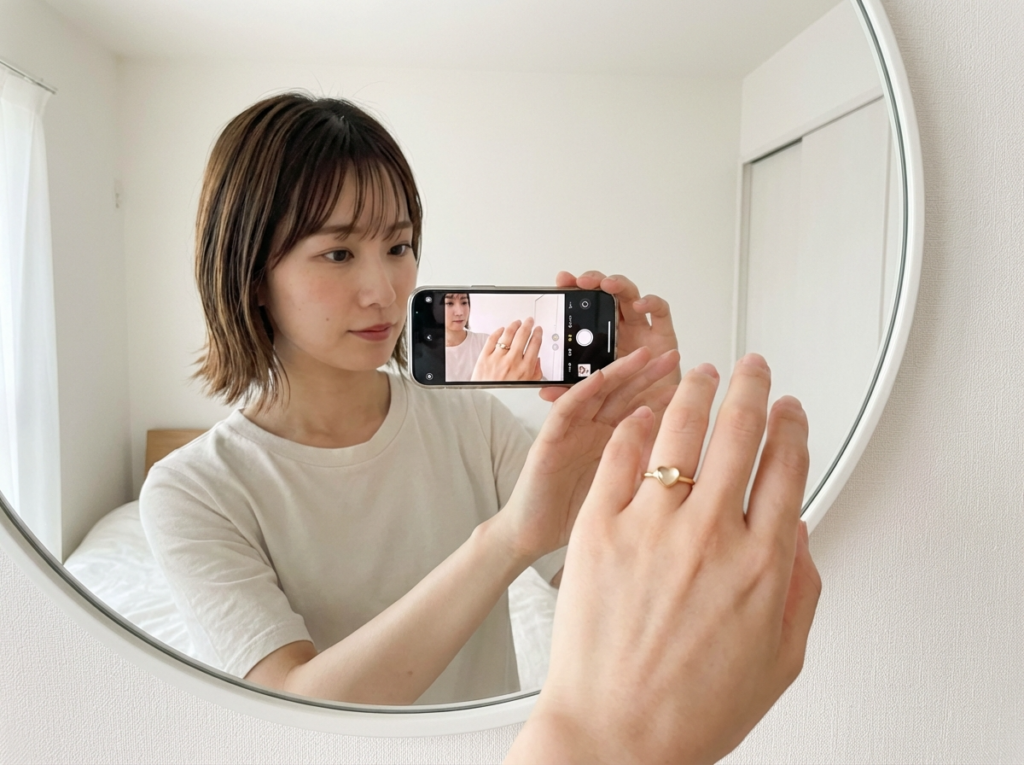 鏡に手をかざし、手の甲側から見たときにモチーフや石が中央に来る位置に回します。そのまま腕を下ろした状態でも、柄が傾かず正面に見えるかを確認します。スマートフォンのインカメラで手元を撮り、写真で見てバランスが崩れていないかチェックすると周りからの見え方も分かります。