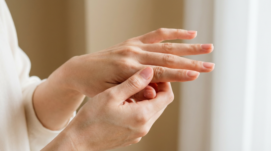 朝や夕方だけ急にきつくなる場合は、脂肪ではなく水分によるむくみの可能性が高いため、まず指の血流を戻します。手を心臓より高い位置に上げて数分保つ、指をグーパーと開閉する、ぬるめのお湯で手を温めると、たまっていた水分が流れやすくなります。
