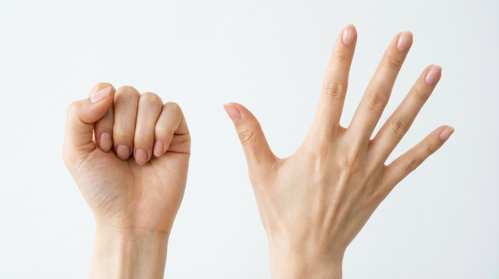 指を動かさずにいる時間が長いと血流が滞り、水分がたまって太く見えやすくなります。手を握って開くグーパー運動を10〜20回繰り返したり、指を1本ずつ反らせたり曲げたりするだけでも血の巡りがよくなり、むくみが軽くなります。