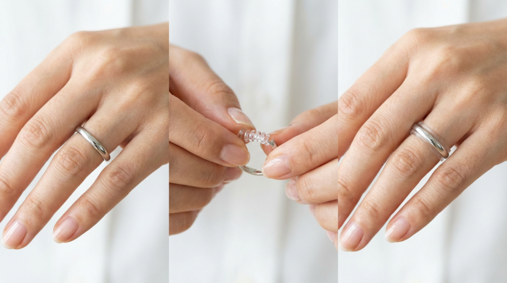 指輪が回ったり抜けそうになる場合は、内側に取り付けるリングアジャスターを使うとサイズを一時的に小さくできます。透明のシリコン製や樹脂製が多く、指輪の裏側にはめ込むだけで指とのすき間が埋まり、落下を防げます。