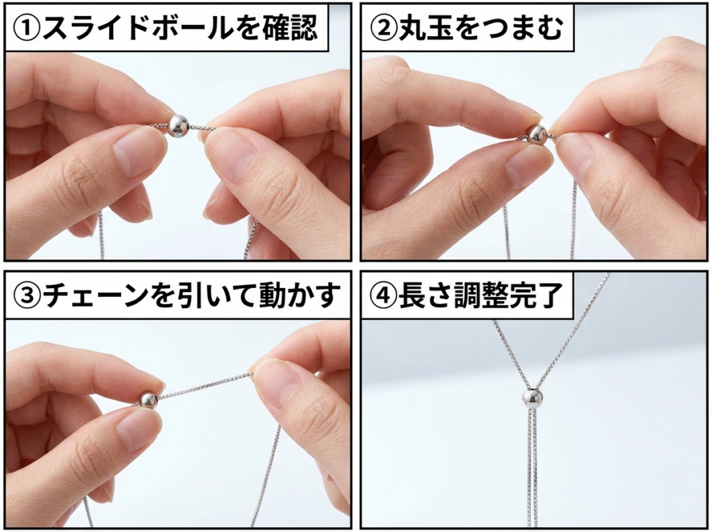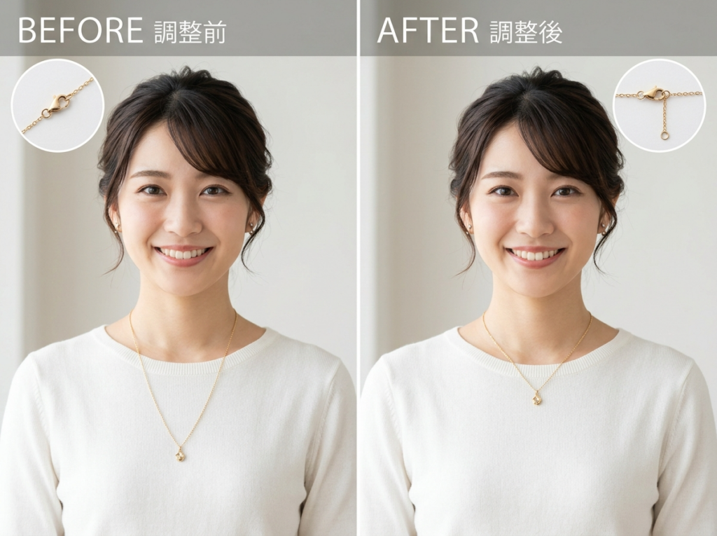まず確認するのは留め具です。アジャスター用の丸カンやスライドボールがあれば、工具なしで数mm〜1cm程度は調整できます。ここで解決するなら、切る必要はありません。