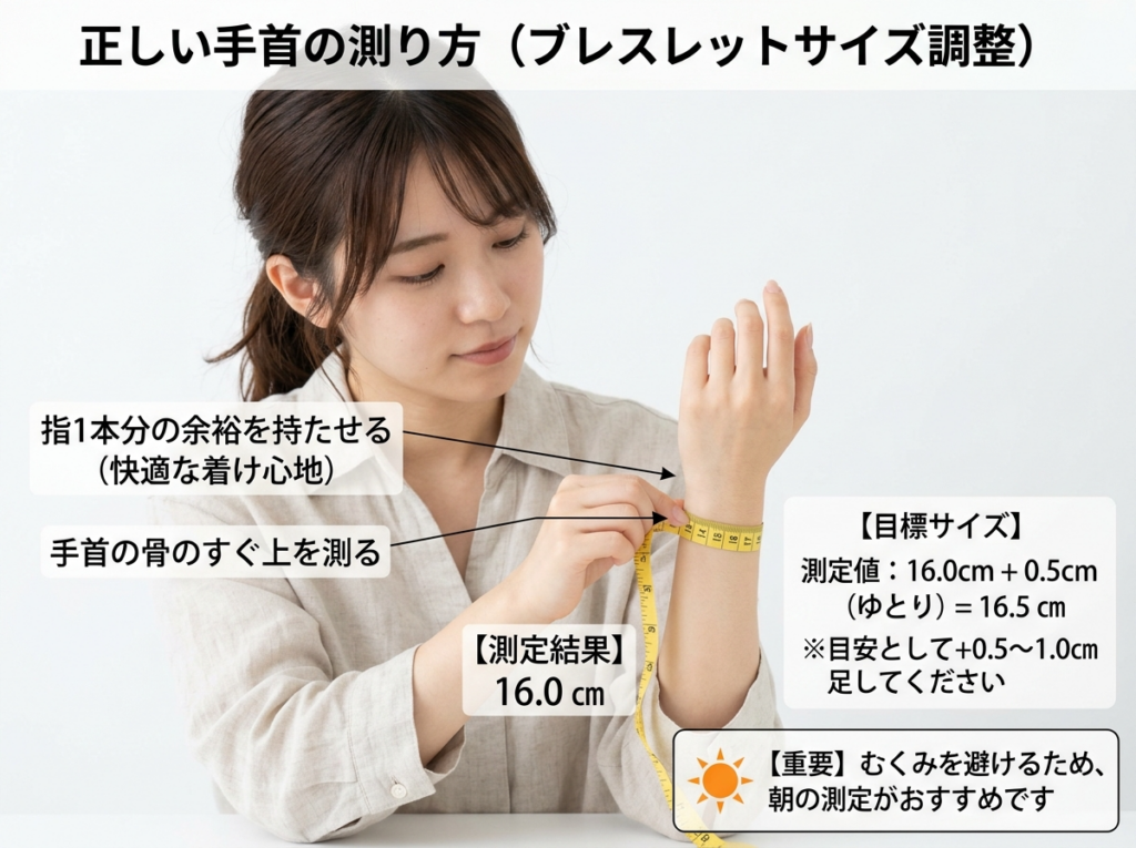 そしてどのタイプでも、作業前に手首の実寸を測ります。実寸+0.5cmを基準にすれば、短くしすぎる失敗を防げます。