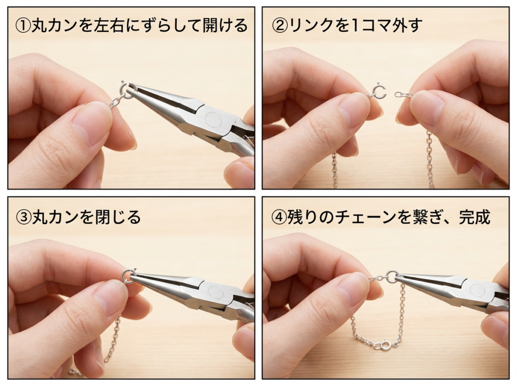 次に、チェーンタイプは丸カンを横に1〜2mmずらして開き、1コマ(約5〜8mm)単位で短くできます。Tバー式も掛け直しはできないため、同じくリンクを外して調整します。