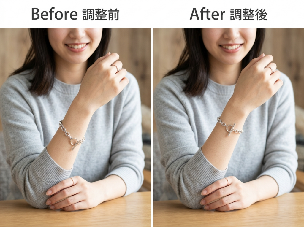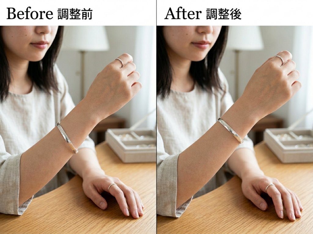 開閉式の金属バングルでも、一度に大きく動かしません。両手で1〜2mmずつ幅を内側へ寄せます。動かすたびに手首にはめて確認します。きしみ音や指先に引っかかりを感じたら、その時点で終了します。ヒビやゆがみが出ると修復は難しくなります。