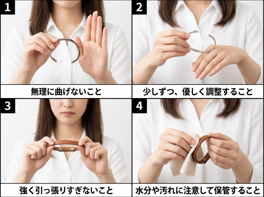 バングルやレザーは、チェーンのようにコマを外して調整する作りではありません。金属を一気に曲げたり、レザーをその場で切ったりすると元の形や長さには戻せません。「少し押せば縮むかも」と力をかける前に止めます。