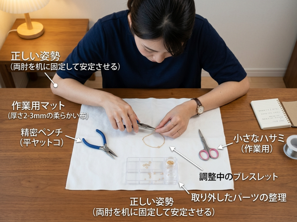 作業は机の上に直接置かず、厚さ2〜3mmの布やタオルを1枚敷いてから始めます。丸カンは直径3〜5mmほどで、弾くと30cm以上飛ぶことがあります。外した部品は手元から10cm以内にまとめて置きます。