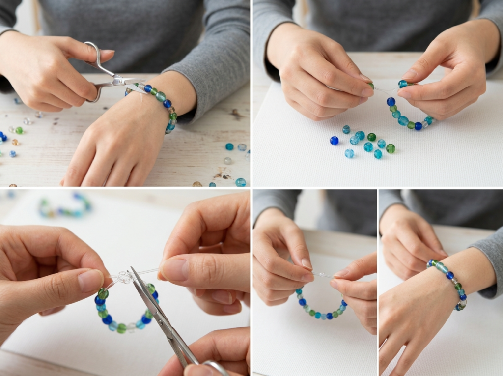 外す数が決まったら、結び目の近くをハサミで1か所だけ切ります。余分なビーズを抜き、左右の並びが崩れていないか確認します。数を間違えると元の長さには戻せません。通し直したら、ゴムを強く引きながら固結びを2回します。1回目より2回目をきつく締めると緩みにくくなります。結び目はビーズの穴に押し込み、外から見えない状態にします。