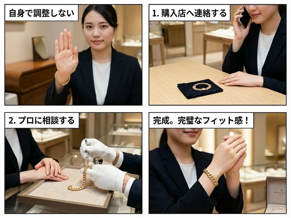 価格が高いブレスレットは、自分で曲げたり切ったりしません。購入価格が数万円以上、素材がK18やプラチナ、ブランド品の場合は、自己調整を行わず専門店へ依頼します。工具で触れた時点で傷がつき、査定額が下がることがあります。